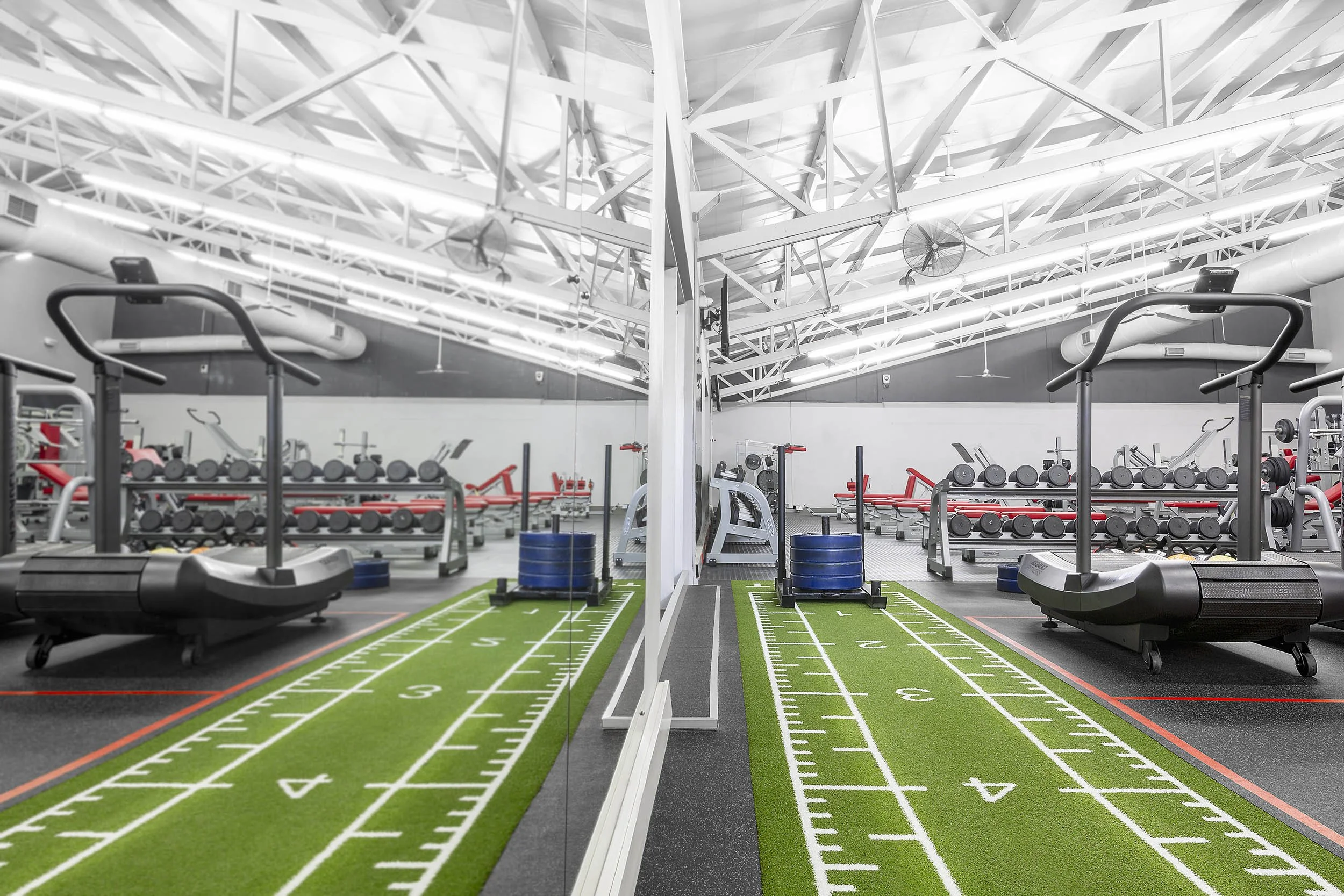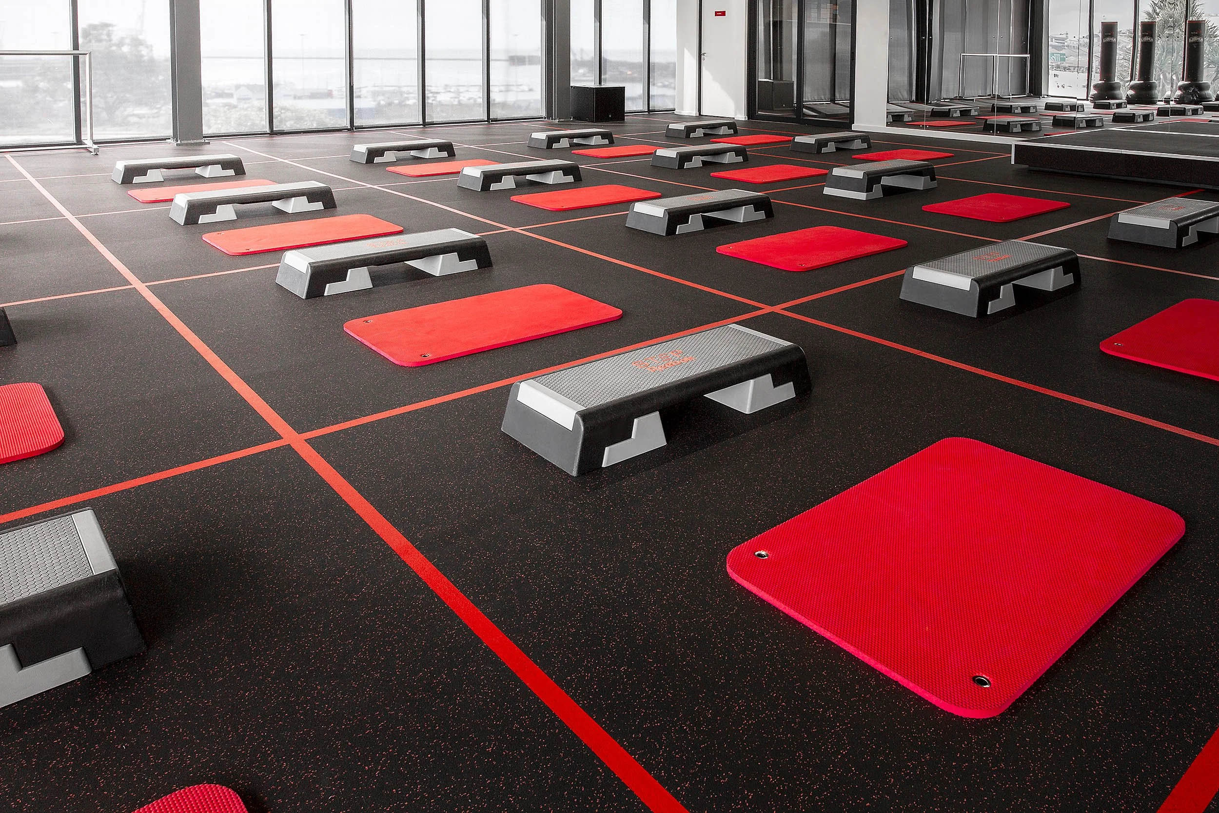 Fitness center featuring wooden wall, black & white equipment used for reformer pilots classes.