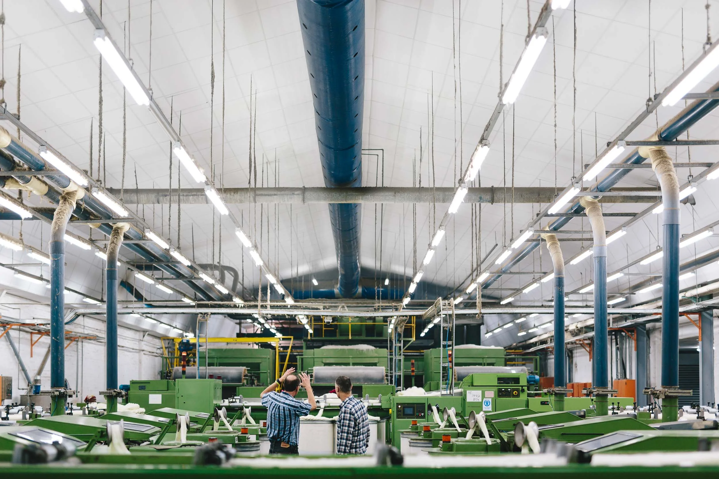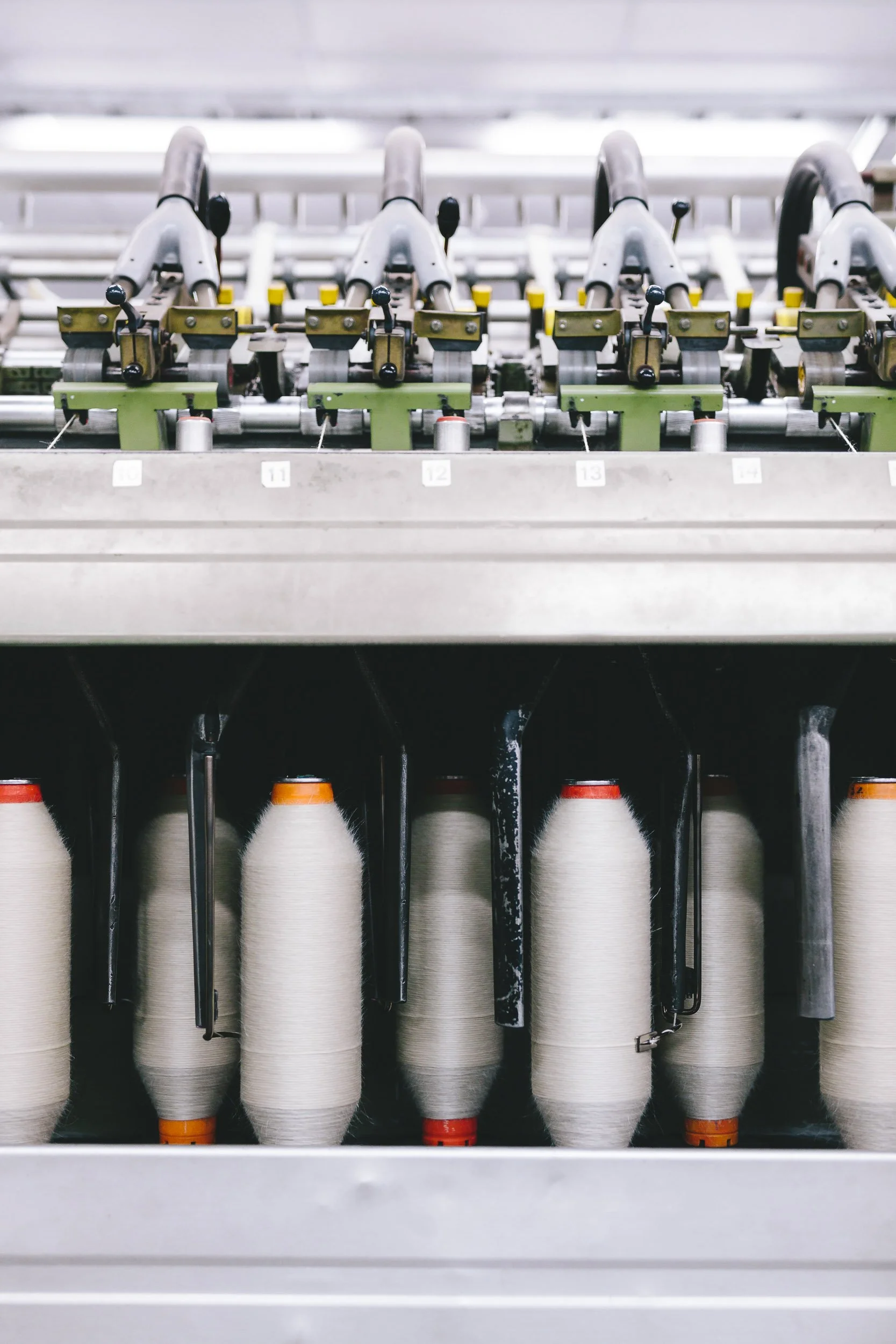 Mohair and wool on spools in a spinning factory space. View fullsize
