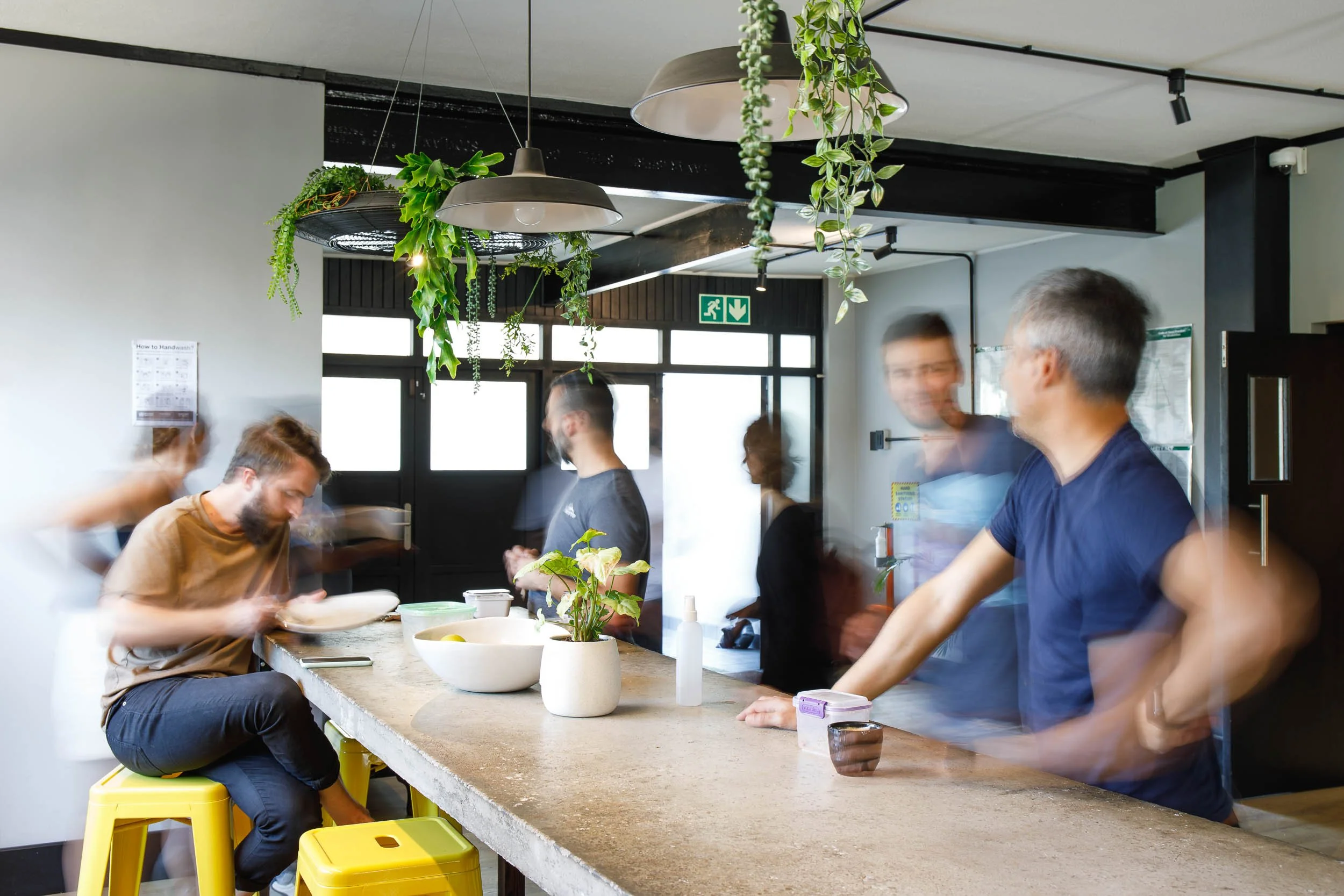 Slow motion capture of team eating in a kitchen counter and going about their busy day.