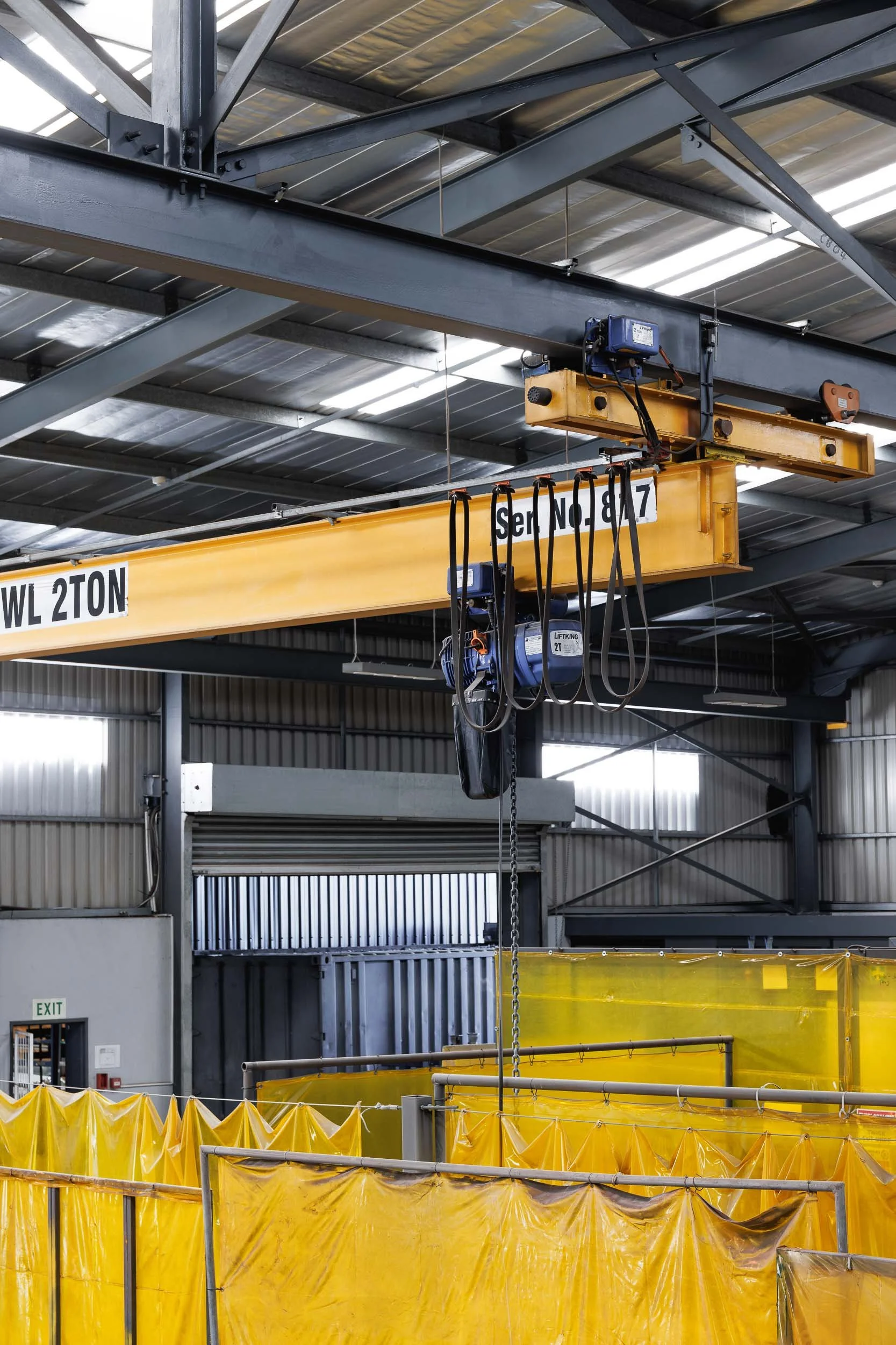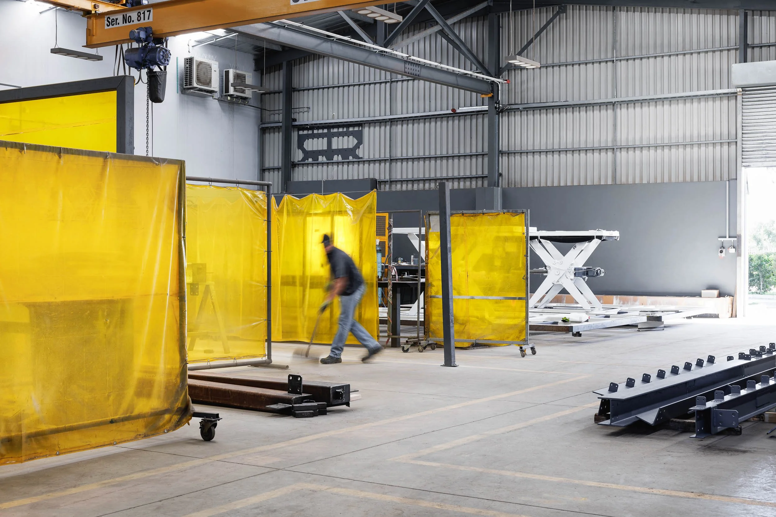 Commercial factory space for automative industry with yellow curtains separating areas for spray painting.