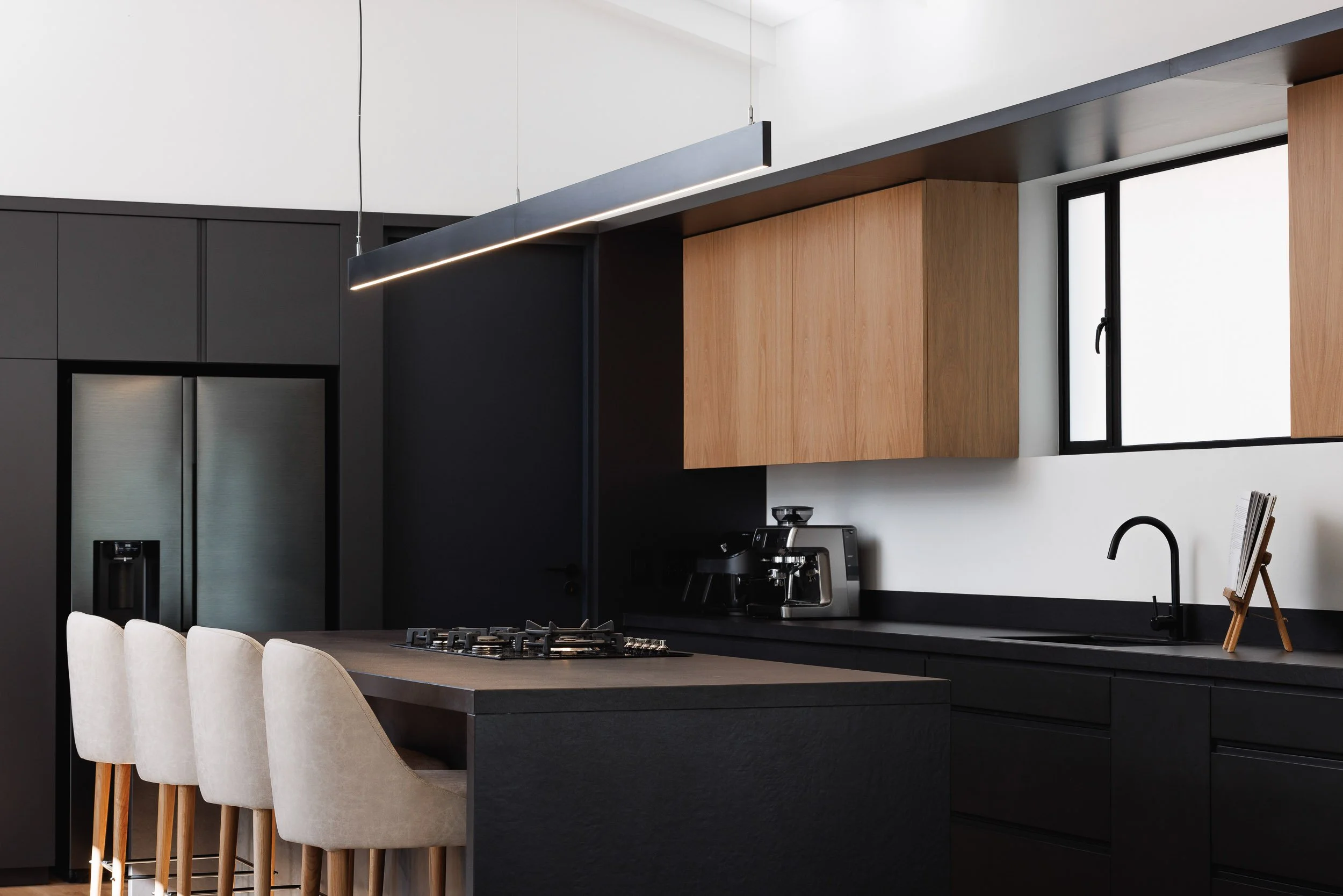 Black kitchen scene with four bar counter chairs and wooden cabinets.