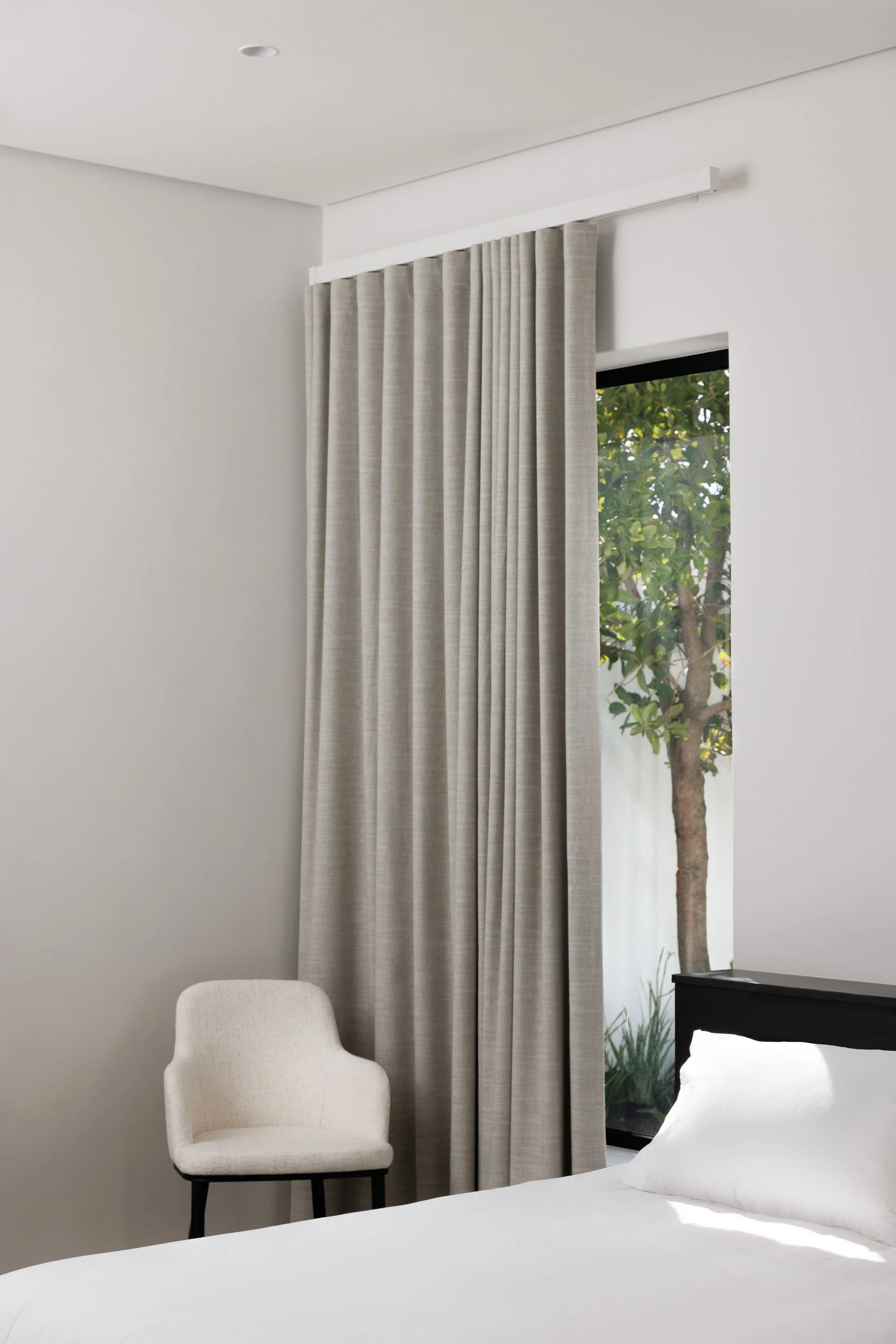 White chair and crisp white linen on a bed with a beautiful view of a green tree.