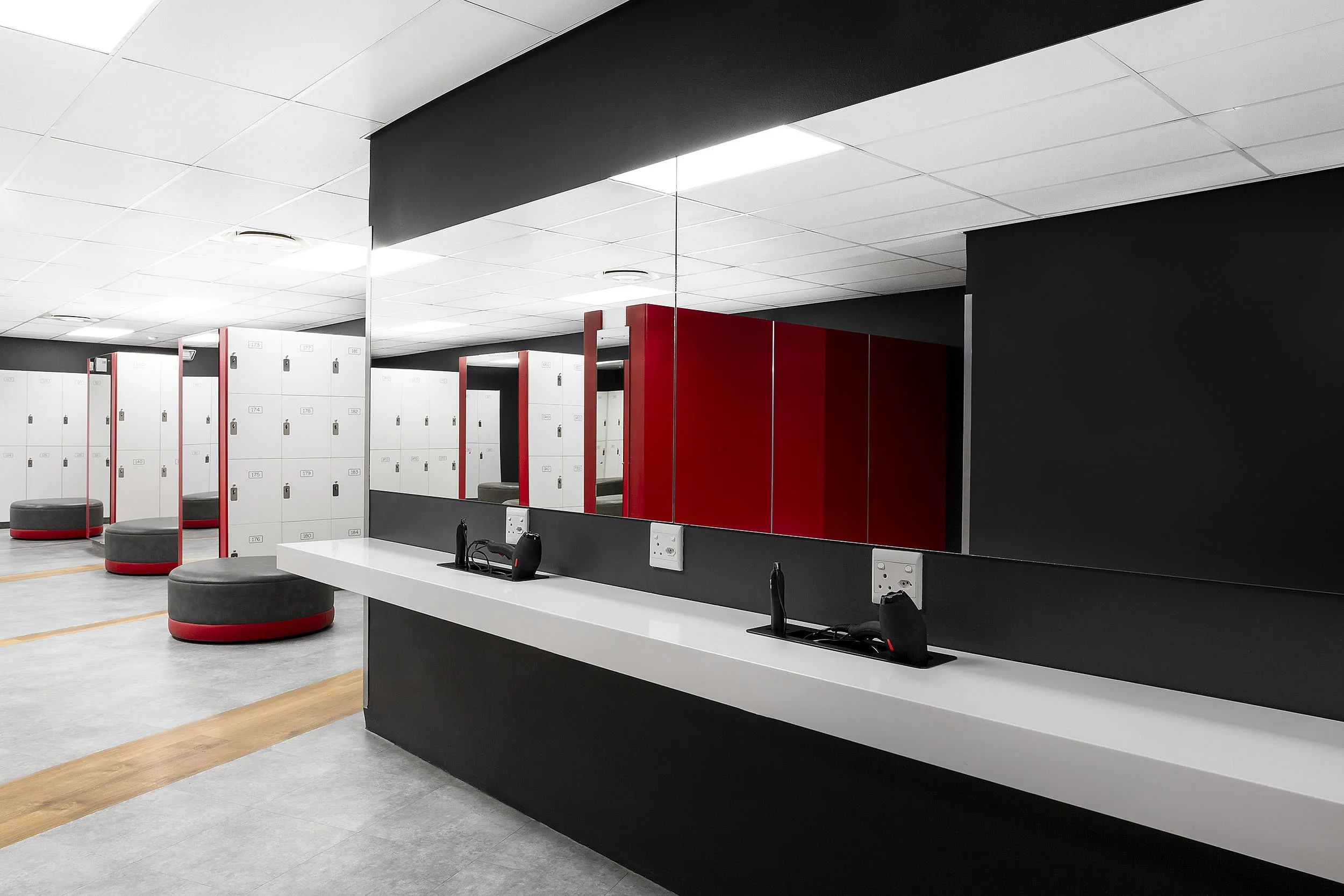 Bathrooms inside gym mirrors reflecting the space. View fullsize