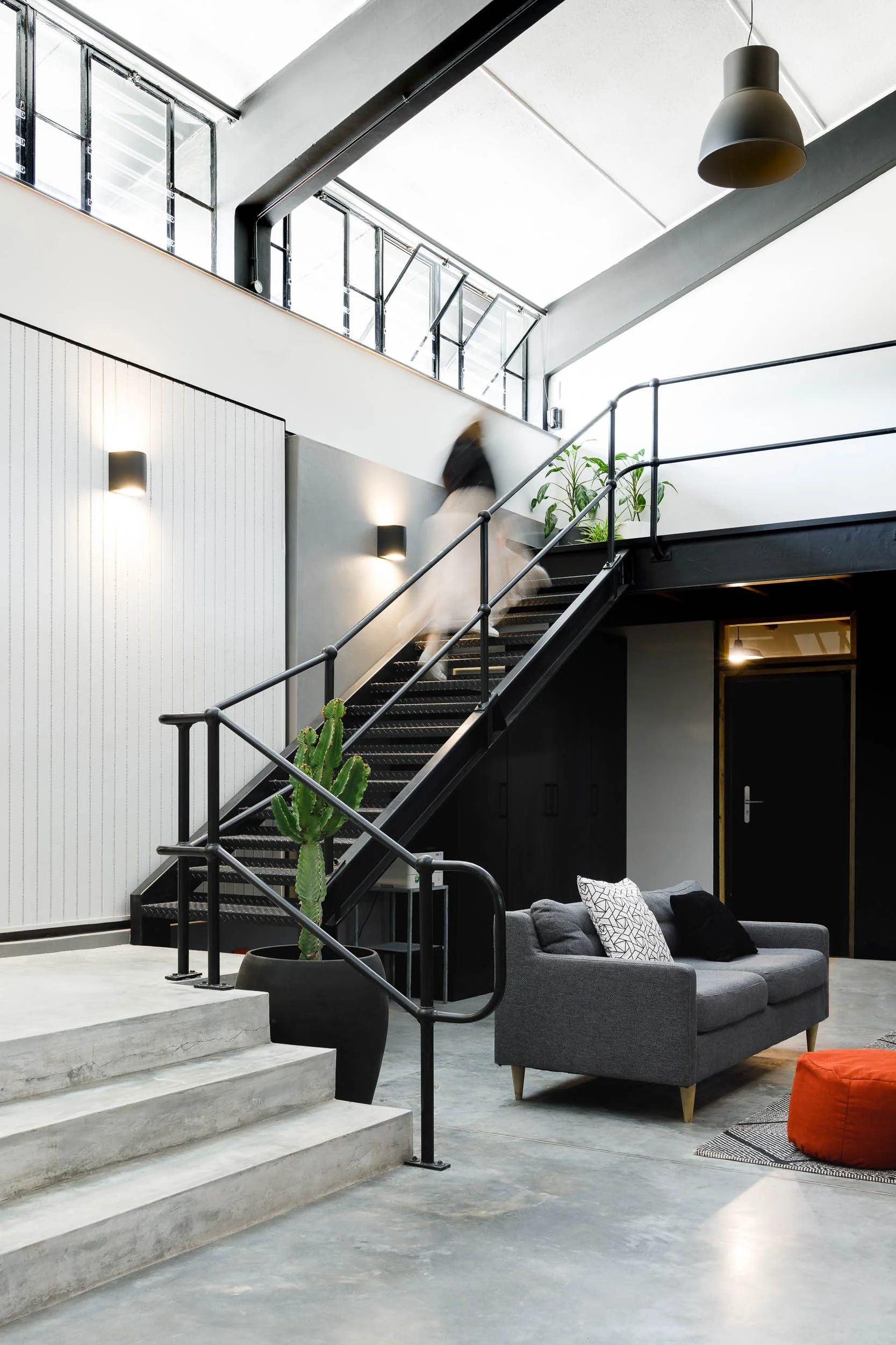 Interior of a contemporary office featuring stairs and a comfortable couch.