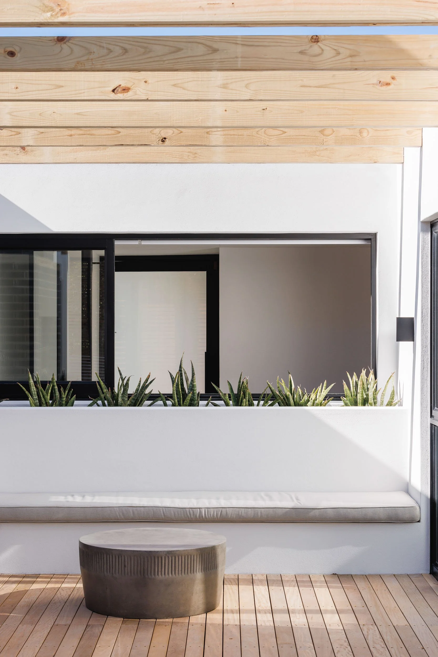 Stacking windows leading off from a wooden deck and a cement seat. View fullsize