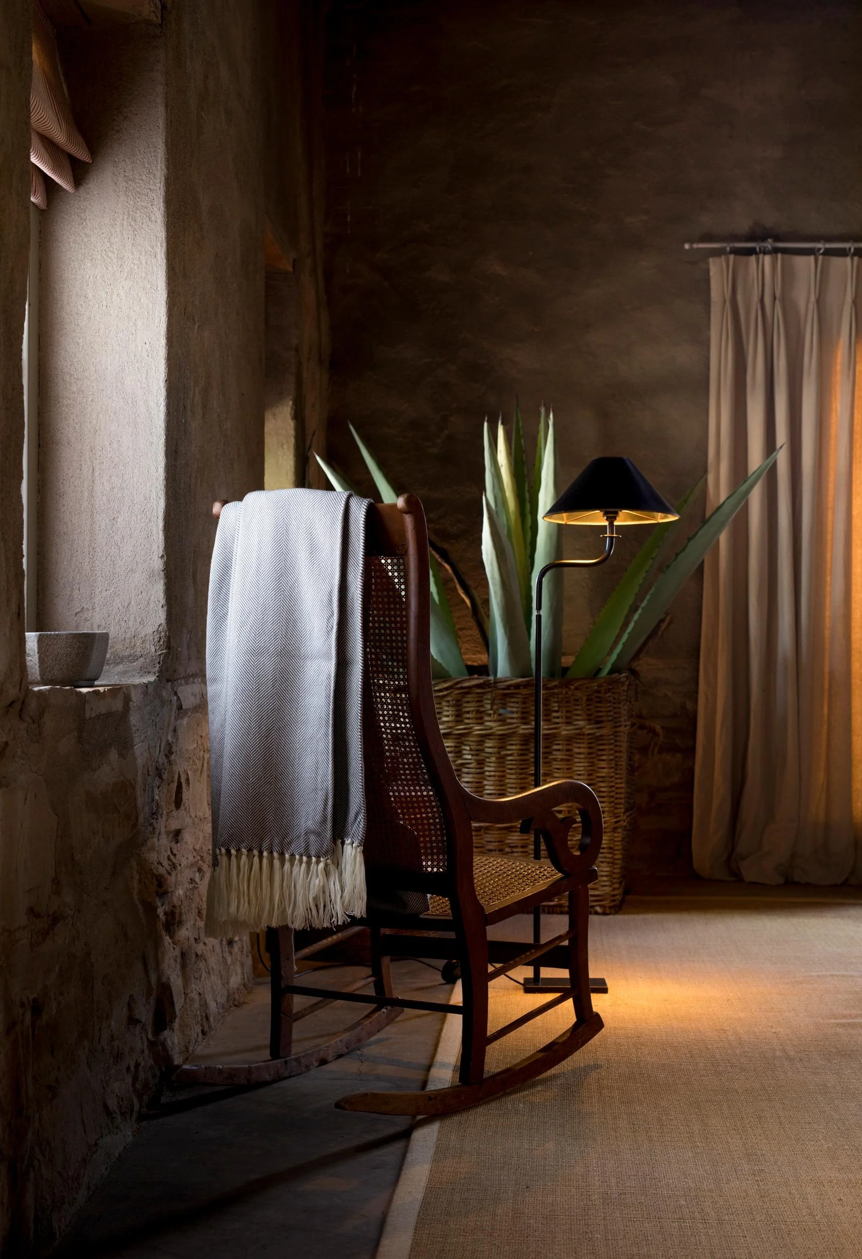 Inviting Karoo living room featuring fireplace and chair with mohair blankets.