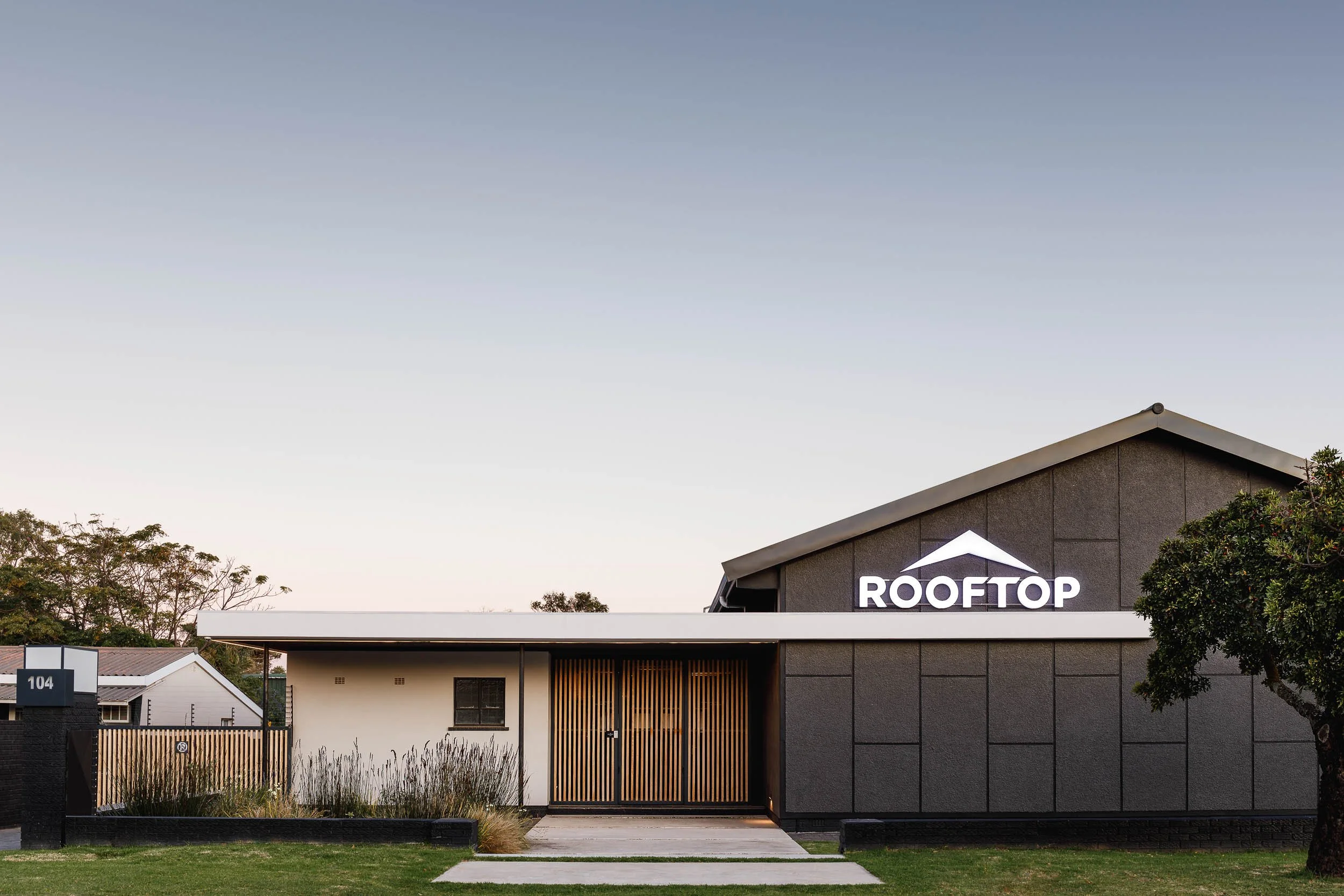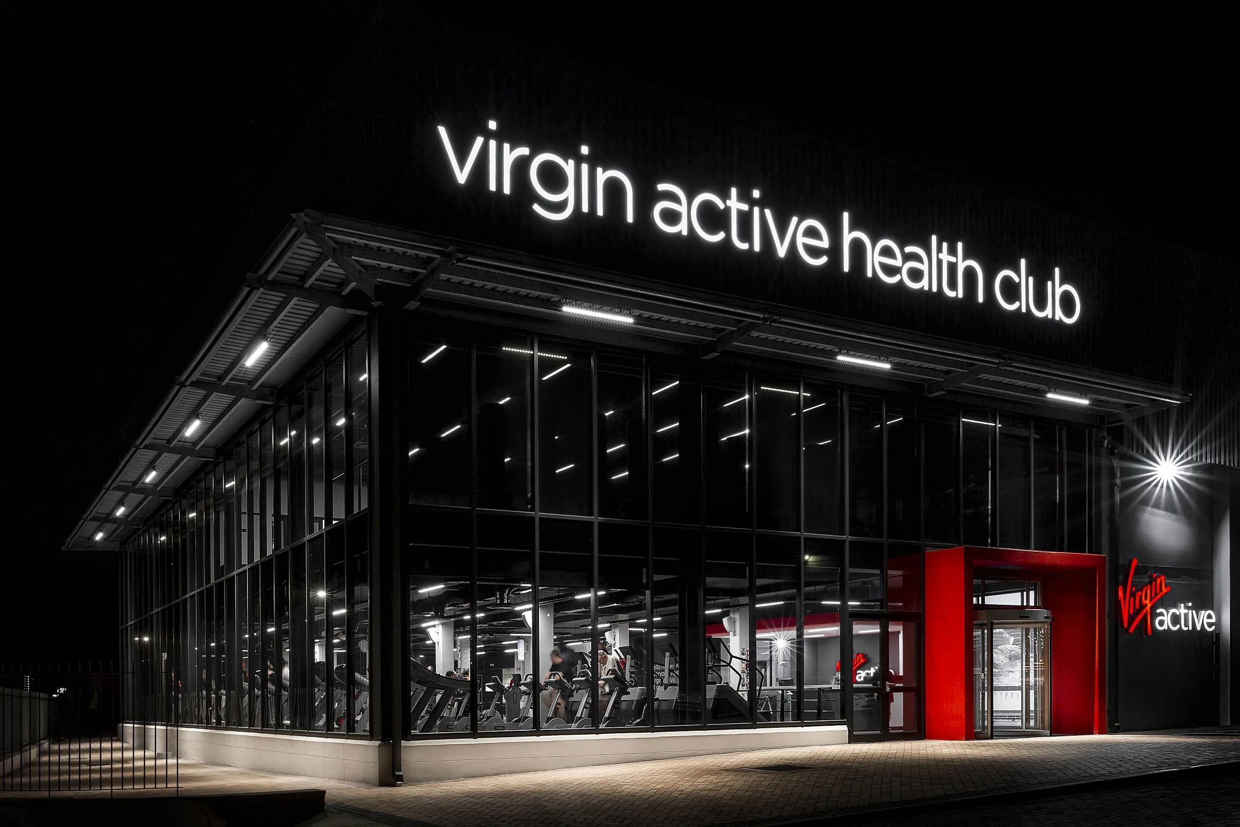 Exterior night time image of a local health club virgin active, neon lights and interior lighting showcase the architectural steel structure and glass. View fullsize
