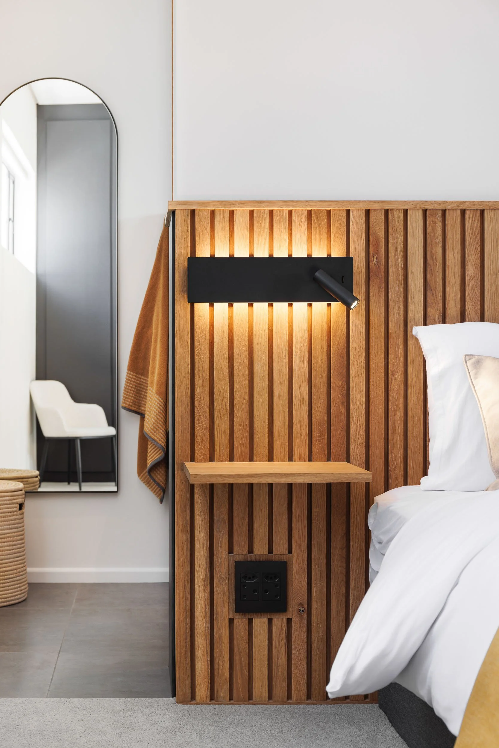 Wooden headboard and mirror in a bright bedroom. View fullsize